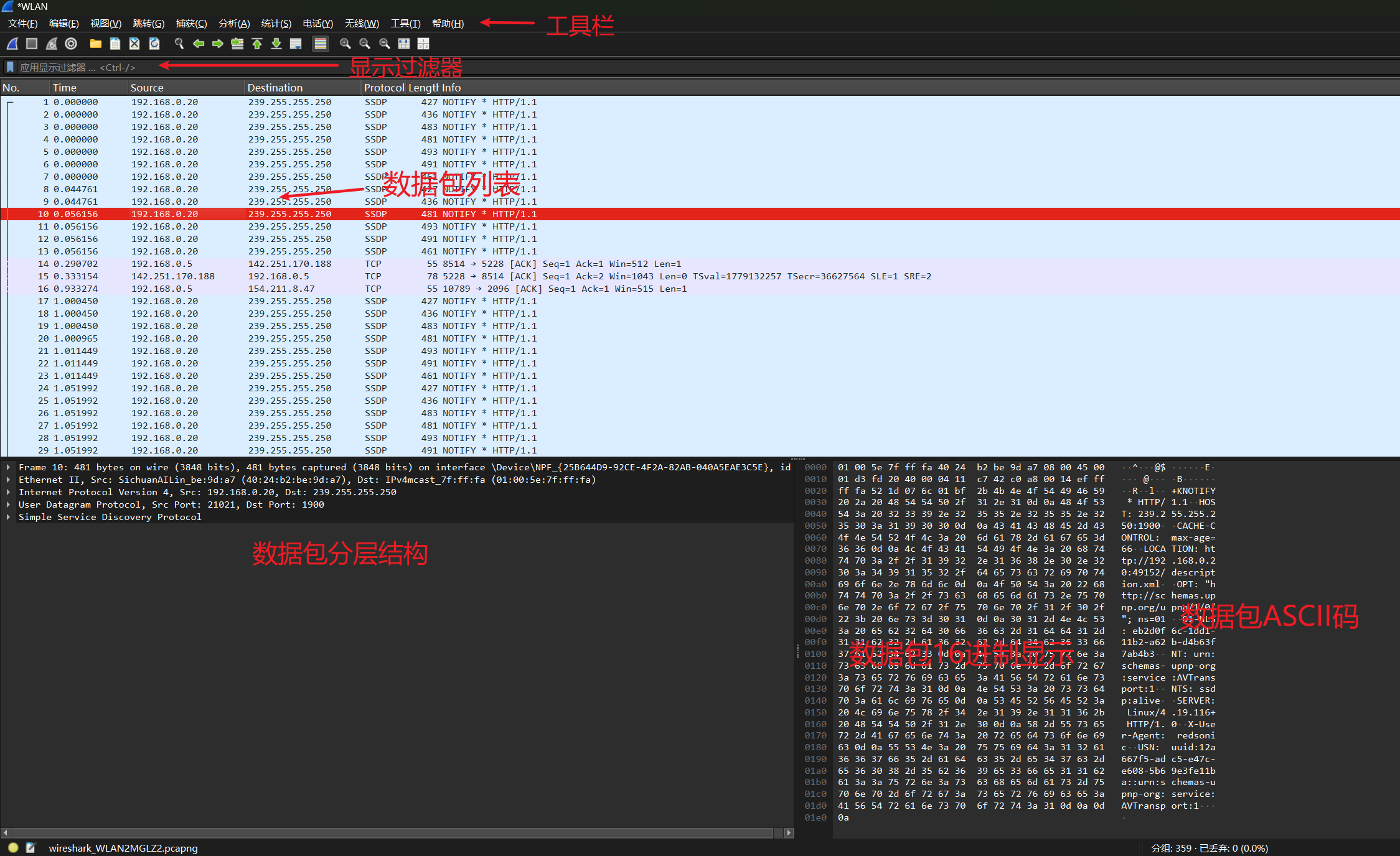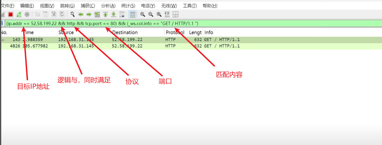 - 如果想排除以上的数据包,只需要将其用括号囊括,然后使用 “!” 即可