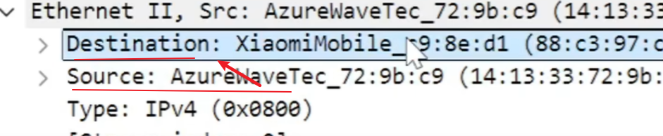 以太网帧的关键信息,包括源 MAC 地址、目标 MAC 地址和帧类型。从数据链路层可以看到数据是从wifi网卡发送到小米路由器。