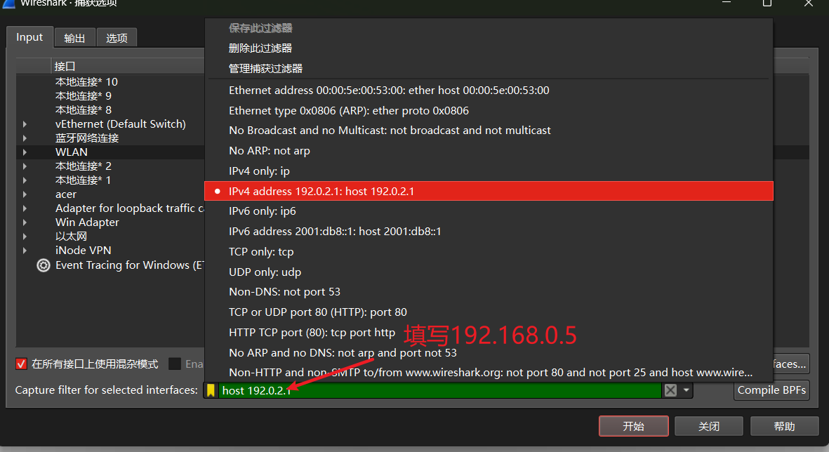 例如我们只想捕获IP地址为192.168.0.5的数据包填写为host 192.168.0.5 ,点击开始就开始捕获了
