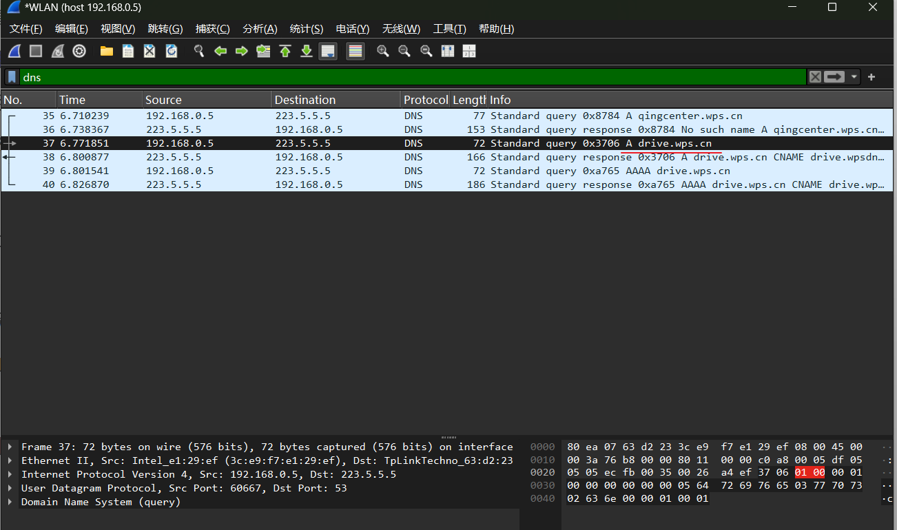 在wireshark中dns是明文显示的
