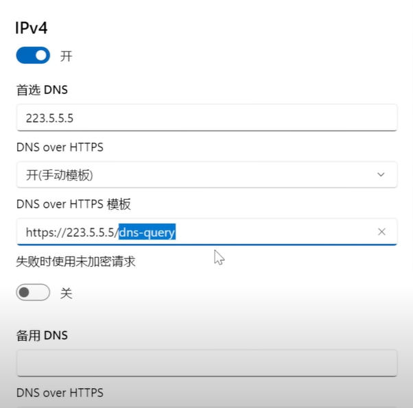 本地电脑可以配置Doh防止被劫持,图中使用的阿里云,记得还要开启时使用未加密请求。这样wireshark就分析不出来使用的是那个网站了。