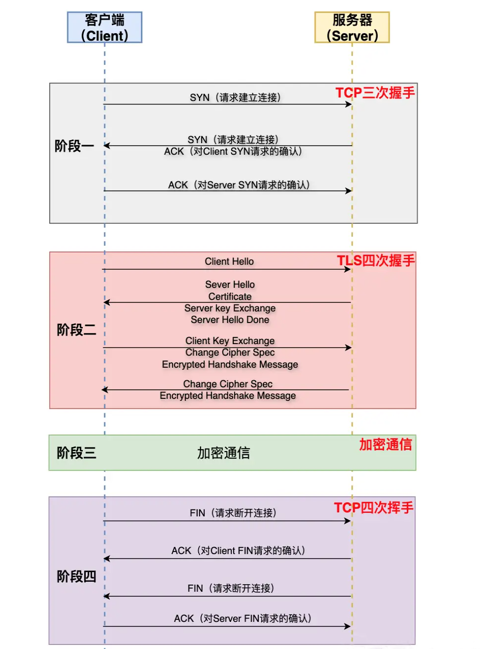 TLS四次握手是TLS协议中用于建立安全连接的过程。它包括以下步骤: 1. 客户端向服务器发送ClientHello消息,包含客户端支持的协议版本、加密算法和随机数等信息。 2. 服务器向客户端发送ServerHello消息,包含服务器选择的协议版本、加密算法和随机数等信息。 3. 服务器向客户端发送Certificate消息,包含服务器的证书信息。 4. 服务器向客户端发送ServerHelloDone消息,表示服务器已经准备好进行安全通信。 TLS四次握手的目的是确保双方都能够协商出一个安全的连接参数,并验证对方的身份。这个过程是加密通信的基础,可以保护数据在传输过程中的安全性。