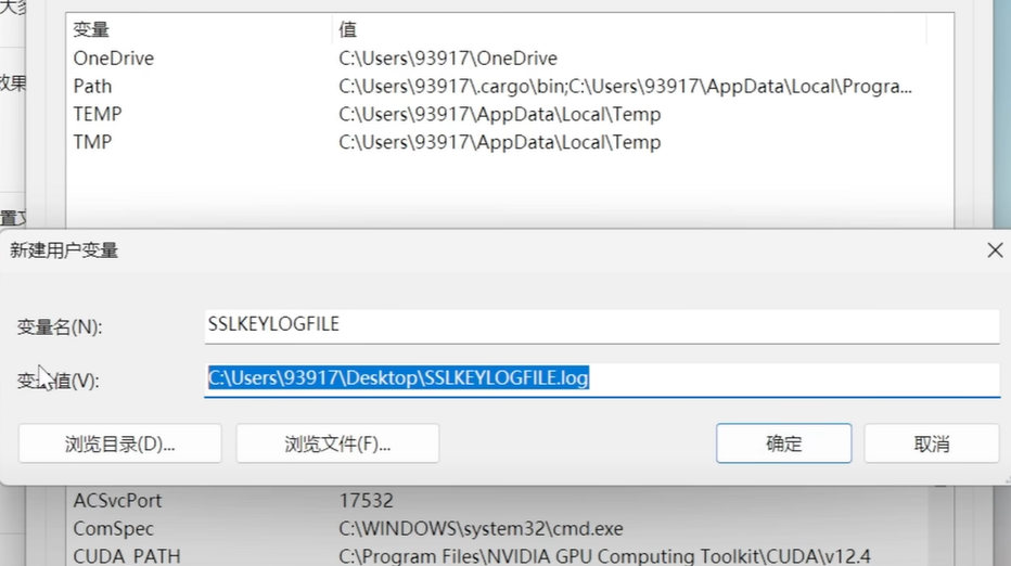 新建一个环境变量,其中SSLKEYLOGFILE必须大写,下面为指定路径