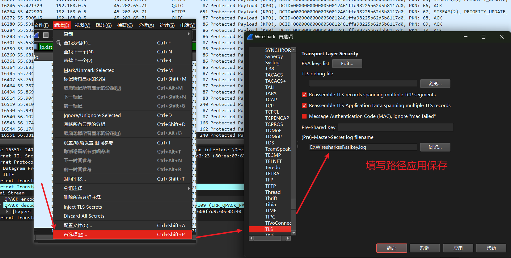 - 中文:编辑 > 首选项 > protocols > ssl (最新版wireshark已经将SSL改为TLS,其实ssl/tls都已统称通信加密协议)